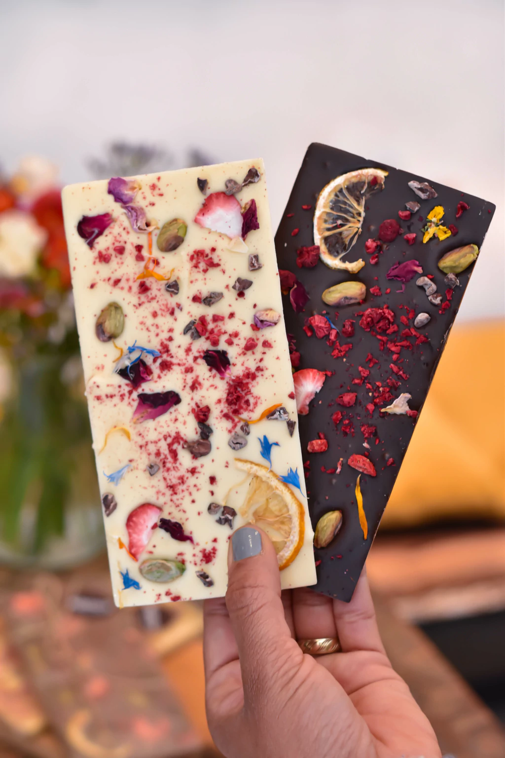 TABLETA DE CHOCOLATE CON FLORES Y FRUTAS